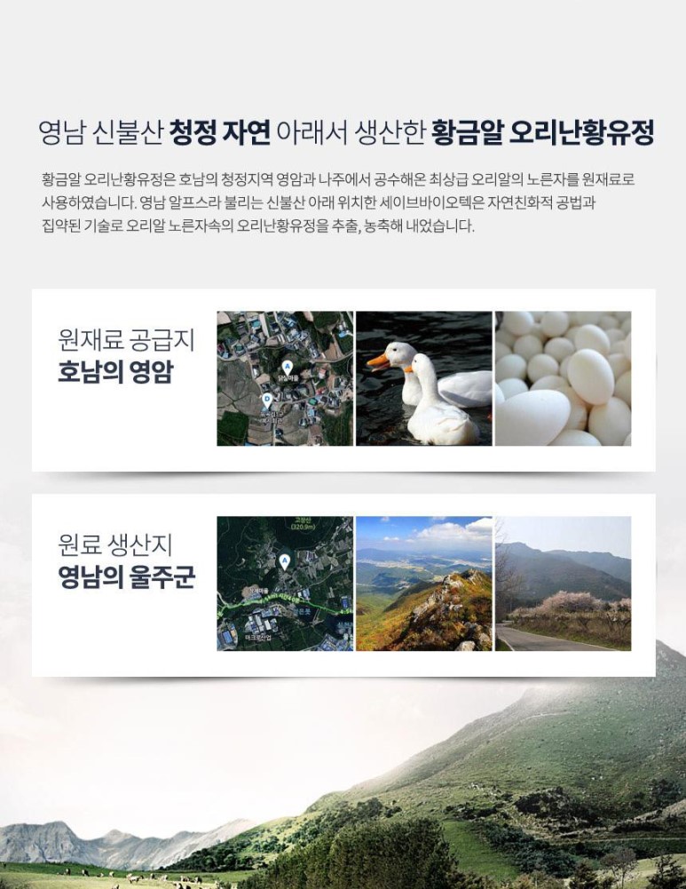 압란정 프리미엄은 청정지역 영암과 나주에서 공수해온 최상급 오리알의 노른자를 원재료로 사용하였습니다. 영남 알프스라 불리는 신불산 (울산) 아래 위치한 세이브바이오텍은 자연친화적 공법과 집약된 기술로 오리알 노른자속의 성분을 추출, 농축해내었습니다.