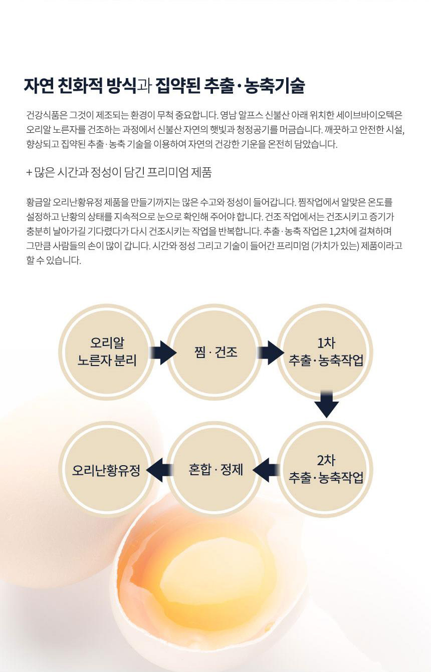 그래서 저희 세이브바이오텍은 식약처 공전에 공인된 추출법과 저희 회사만의 특수 공법을 적용하여 오리알 노른자 속의 콜린과 레시틴 성분을 추출 농축해서 제품화하였습니다.